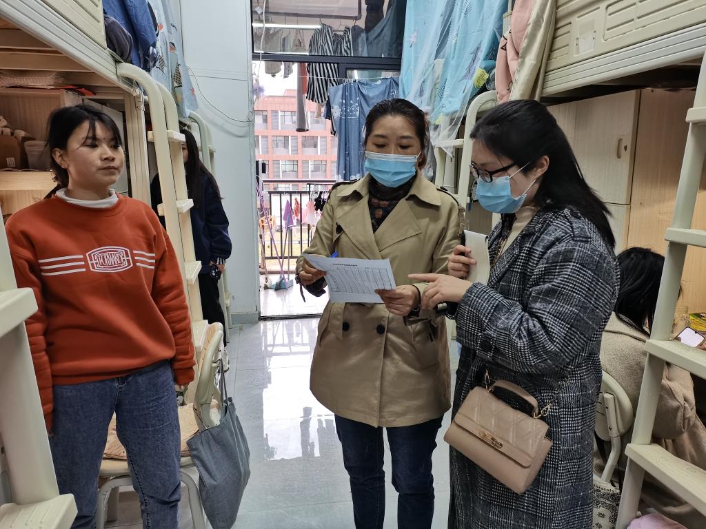 学工处值班人员入住学生宿舍。为加强值守力量,党支部书记谢海英带领辅导员入住学生宿舍,以“担当、尽责、奉献”的姿态,确保24小时“不掉线”。不定期抽查学生在宿舍每日监测体温情况,及时通报,及时督促整改。宿管人员每日检查宿舍卫生,确保开窗通风、环境整洁,防止细菌滋生。对于学生反馈的各类问题(如维修等),也不厌其烦地解答、协调、疏导。做到深入学生勤巡查,妥善处理勤协调,立即落实不拖拉。专人负责统计每日的疫情防控统计数据,监测动态,确保将各部门需要的疫情防控数据有效整合,发现问题立即查清,做到底数清,变化明,台账细,人员管控到位。支部党员还参与到学校疫情防控志愿服务活动中,到食堂维持秩序、督促学生佩戴口罩。部分党员参与滩下社区上户排查、登记核酸检测等志愿服务。